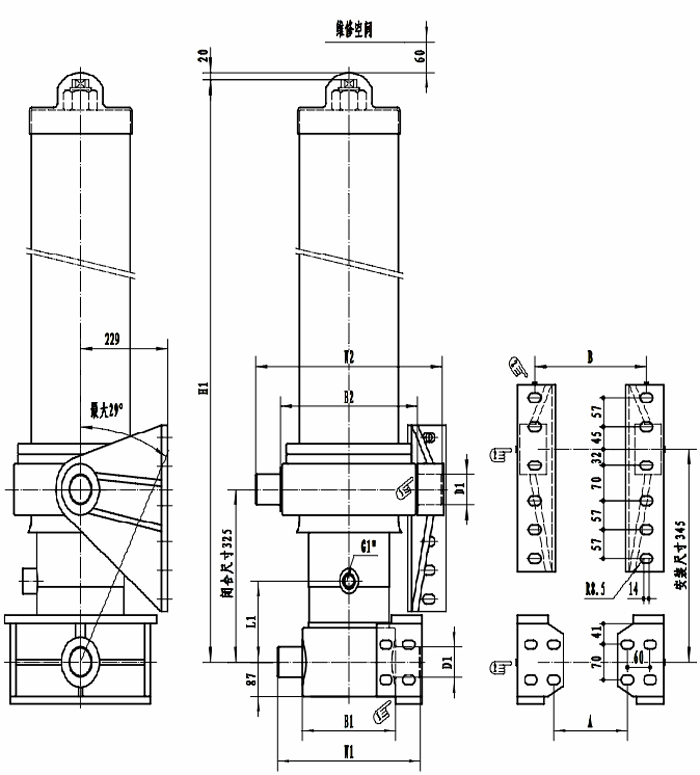 | B1/W1 | 265/405 | 215 | D1有 60/ L1 有160/ H1為液壓缸封閉尺寸,對(duì)照上表具體型號(hào)。 所有安裝螺栓及自鎖螺母的規(guī)格為M16。 墊圈規(guī)格為φ17× 支座與液壓缸之間的最大間隙為 鎖緊支座螺栓后,焊接定位板。 |